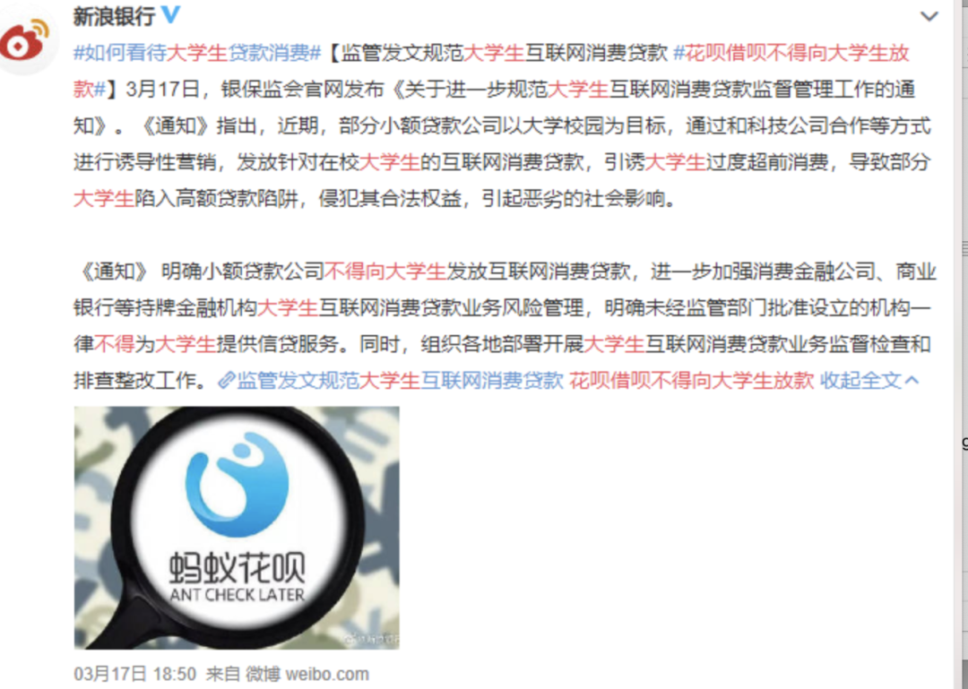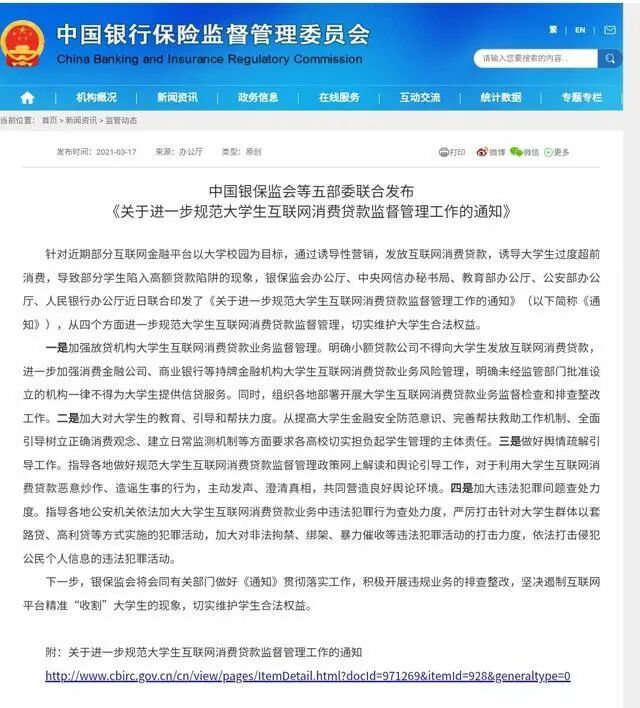 3月17日,银保监会官网发布了《关于进一步规范大学生互联网消费贷款监督管理工作的通知》,文中提到,小额贷款公司不得向大学生发放互联网消费贷款,或者用营销方式诱导大学生贷款。
