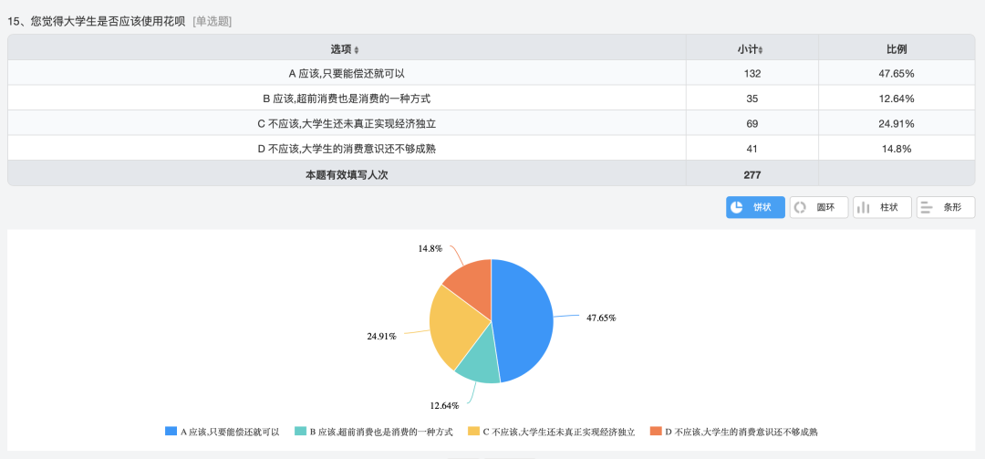 大学生因为超前消费,而背上校园贷的新闻并不少见,公众也倾向于反对态度。但对于花呗和白条等互联网贷款,大学生其实并不太排斥。根据一项针对200名大学生的小规模调查显示,认为“大学生应当使用花呗”的人数达到了60%。
