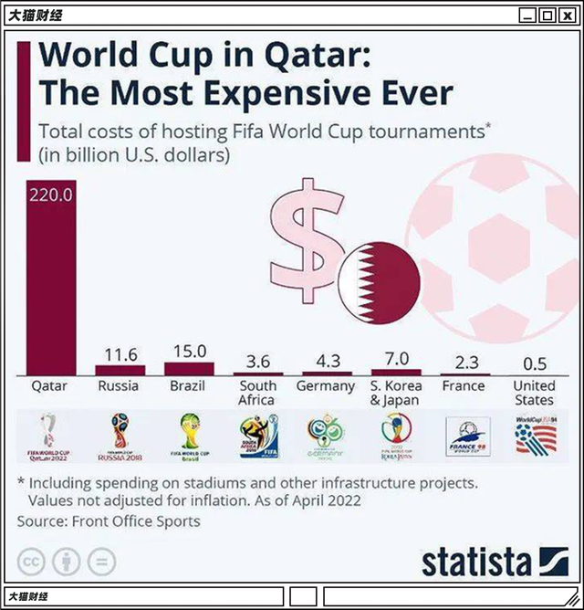 按照部分媒体的统计,2022年卡塔尔世界杯的总开销约为2290亿美元,这差不多是2018年俄罗斯世界杯成本的20倍,2010年南非世界杯成本的50倍,以及1994年美国世界杯成本的400倍。