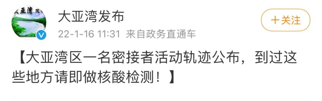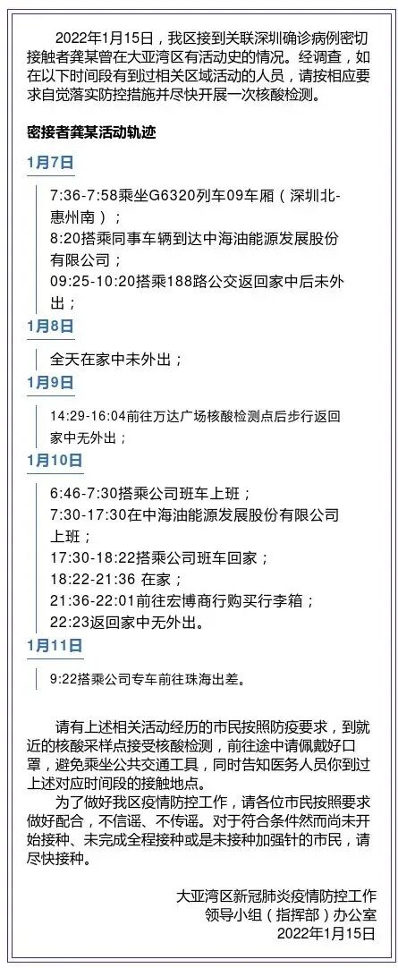 16日上午11:31,惠州大亚湾经济技术开发区管理委员会新闻中心官方微博@大亚湾发布 通报,1月15日,惠州大亚湾区接到关联深圳确诊病例密切接触者龚某曾在大亚湾区有活动史的情况。经调查,如在以下时间段有到过相关区域活动的人员,请按相应要求自觉落实防控措施并尽快开展一次核酸检测。具体如下: