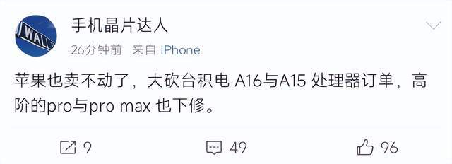 每一年的双十一都是换购手机的高峰期,今年也不例外,但是苹果却在这个时间点被爆料“卖不动”了。著名爆料达人@手机晶片达人表示:“苹果也卖不动了,大砍台积电A16、A15处理器订单,高阶的Pro与Pro Max也下修。”