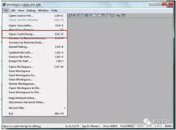 1、下面我们选择打开日志文件,从开始菜单中选择 Open Crash Dump...