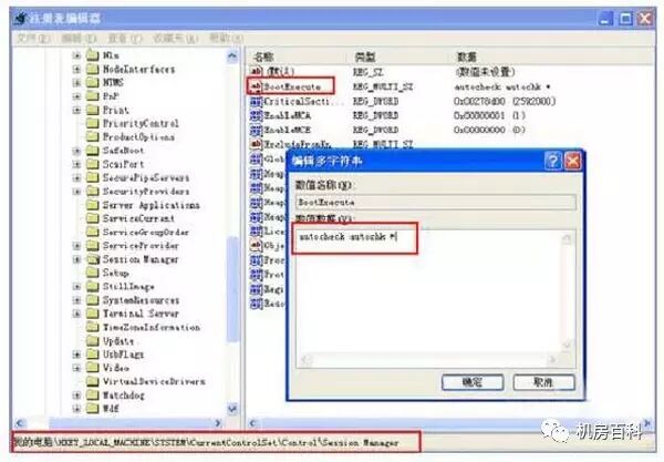 2、 依次展开 “HKEY_LOCAL_MACHINE ”→“SYSTEM ”→“CurrentControlSet ”→“Control ”→“SessionManager ”,在右侧找到BootExecute项,双击将其值设置为“ autocheck autochk *”。 经过这样设置以后,如果电脑出现蓝屏,将会在电脑重启后自动运行自检程序,试图对系统中存在的错误进行修复。