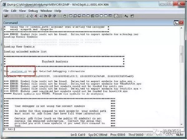 如下图中红框标记提示:Use !analvze -v to get detailed debugging information