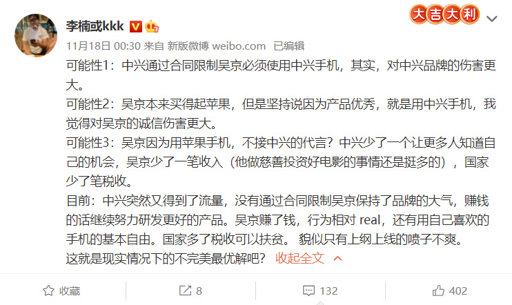 可能是因为上面说得有些过火,李楠进一步解释,如果中兴通过合同要求吴京必须使用中兴手机,真正受到伤害的是中兴手机自己。而如果因为吴京买得起苹果手机,却还要坚持说中兴手机更好,这也是对吴京本人诚信的伤害,毕竟代言中兴只是为了赚钱而已,中兴能获得流量就不错了,苹果比中兴手机更好,或者说比国产品牌更好这是事实,中兴手机在签合同时也必须保持“大气”。