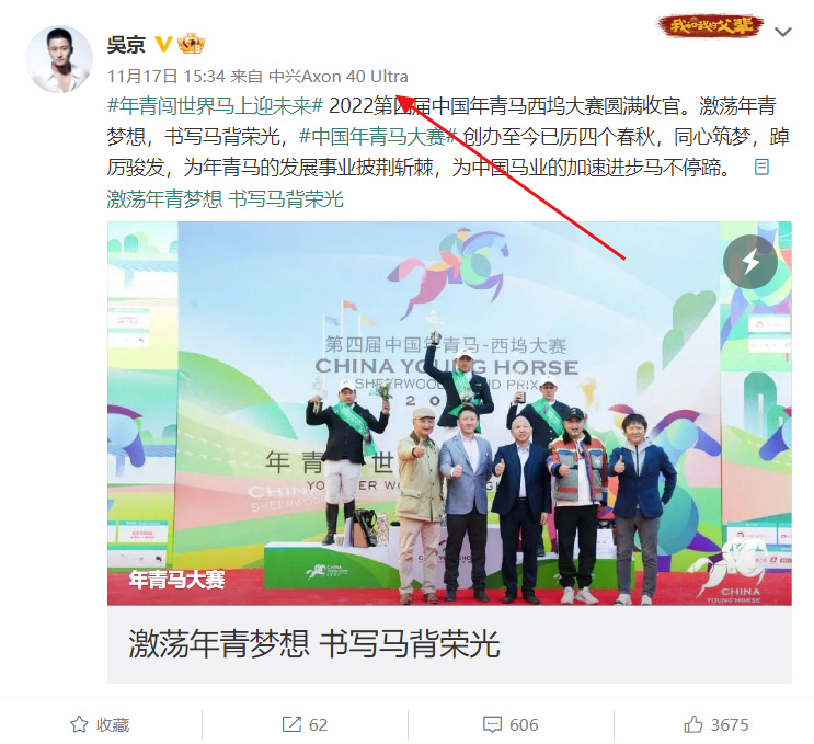 虽然李楠竭力支持吴京,支持明星在代言国产手机的同时还用iPhone,但吴京本人似乎认为这么做并不妥贴。在最新发布的一条微博中,显示信息来源为中兴Axon40Ultra,而非吴京在现实中使用的iPhone手机,不知道李楠对此如何感想。