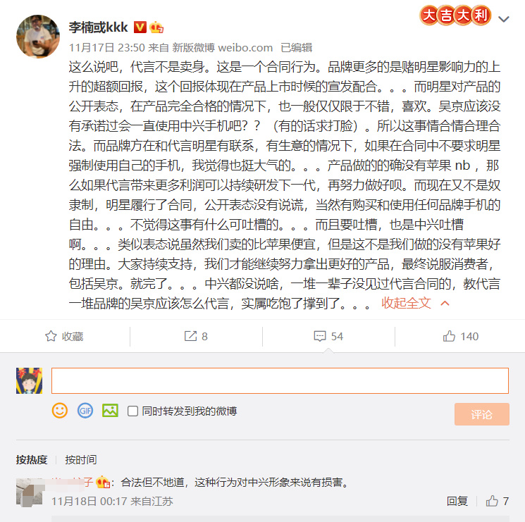 李楠评价这件事情,认为代言只是一种合同行为,品牌方是在借明星的影响力提升超额回报,而明星只需要在公开场合表态支持就行,没有必要真正的为这款产品而着想。喜欢就用,不喜欢就不用,吴京应该没有承诺过一直使用中兴手机吧?