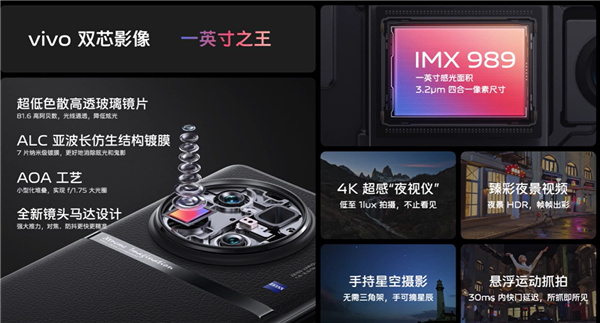 而且这次vivo还采用超底色散高透玻璃镜片,1G+7P镜片模组,透光性更好,加上全新蔡司T*镀膜,有效降低炫光和鬼影,号称1英寸大底手机之王。