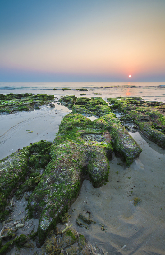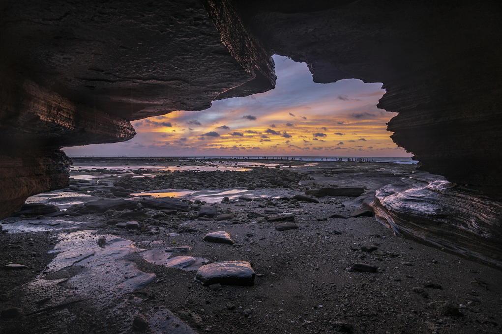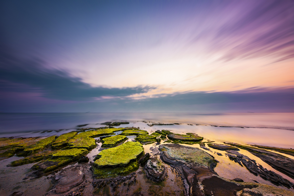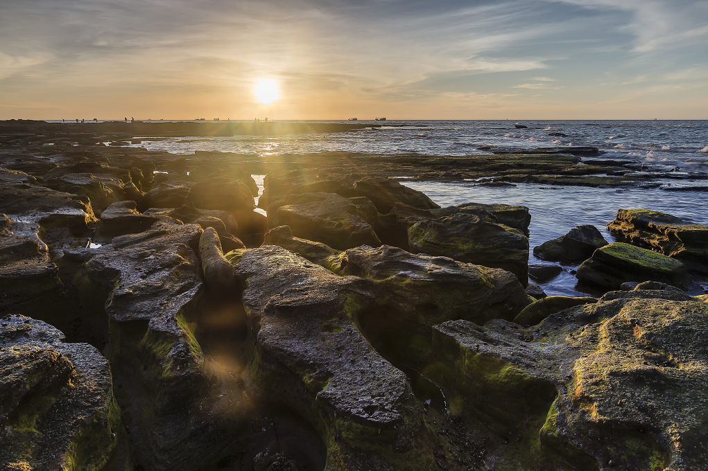 退潮时的五彩滩,可以见到一层又一层的海蚀沟,在阳光的照耀下,十分漂亮。早晨起来,太阳从东方升起,可以看到与众不同的火山岩日出。