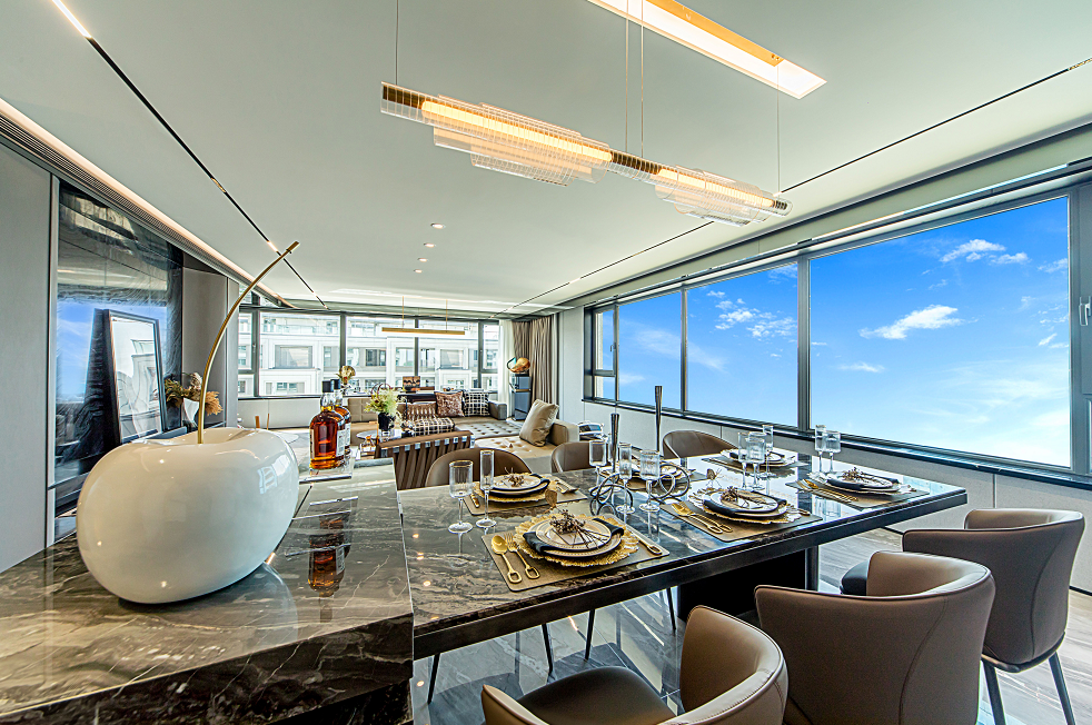 比如西户建面约160㎡的宽境洋房,不仅扩大窗子的尺度,而且做了270°南面和西面双采光,居住感就像从普通影院升级到了IMAX宽幕影厅,全天侯阳光充足,景观视效亦更上一层楼。