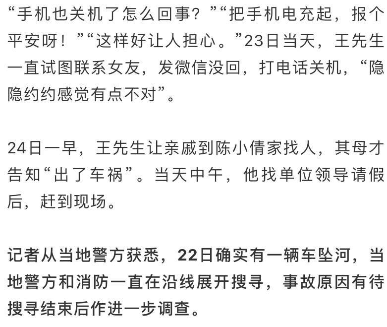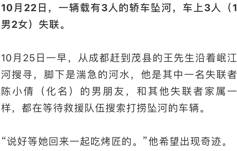 王先生介绍,车上3人失联,包括男司机谢某、陈小倩和另外一名女生小文。