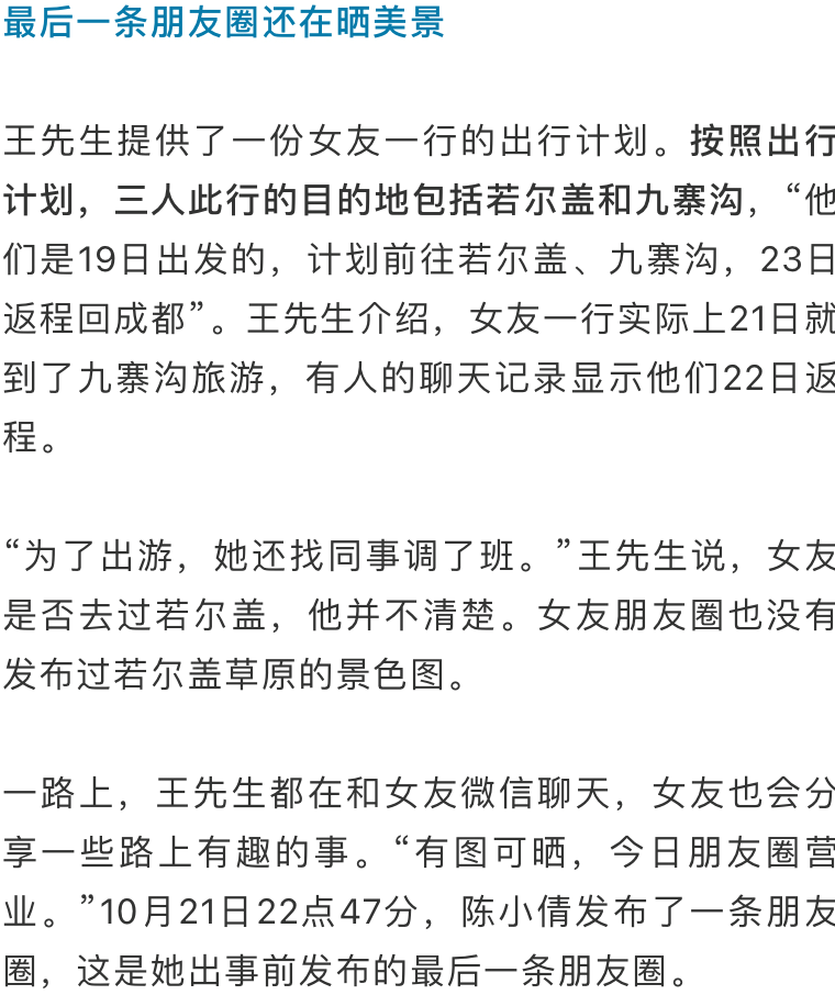 王先生在22日16点22分曾给女友发消息询问“返程了没有”,但未收到回复。他最初还以为是对方手机没电了,但直到当天晚上,女友也没回消息。