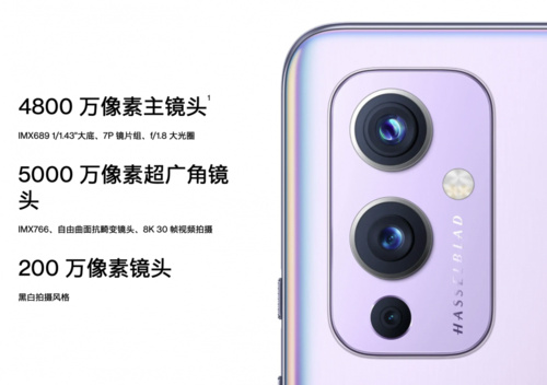 一加 9采用三摄设计,主摄为4800万像素的索尼IMX689传感器,支持双原生ISO和全像素全向对焦技术,配合出色的硬件性能和软件算法升级,轻松拍摄出画质出众的超清照片。超广角镜头作为日常高频使用的镜头,一加打破行业中普遍对超广角的副摄定位,为一加 9配备主摄级超广角IMX766传感器,通过5000W像素配合1/1.56英寸大底,显著提升超广角画面品质,针对超广角畸变难题,一加 9主摄级超广角加入自由曲面镜头,硬件级改善超广角畸变问题,使得超广角照片的畸变由20%大幅降低至1%左右。借助这颗主摄级超广角,一加 9还能拍出画质优秀的微距照片。此外,一加 9系列还配备一颗原生黑白镜头,帮助用户创作独特摄影风格的黑白作品。