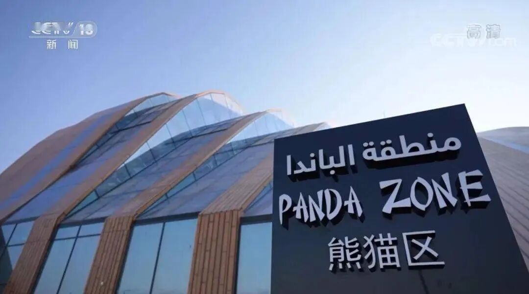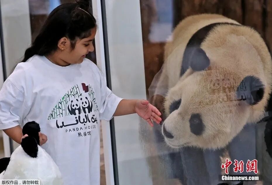 卡塔尔首都多哈的豪尔大熊猫馆内,一名儿童隔着玻璃与大熊猫互动玩耍。