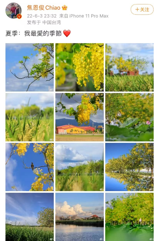 如今的焦恩俊开启了幸福的“退休生活”,不再像以前那样拼命维持自己的帅气形象,放任自己自然地老去。如今他也爱上了摄影,经常在其个人社交账号上晒出各种作品。