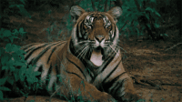 后来人间又受到东海龟怪的骚扰,虾兵蟹将作恶人间,老虎再次来到凡间除恶。玉帝一高兴,又给老虎记一大功,在它额头的三横之中添了一竖。于是一个醒目的“王”字出现在了老虎前额。从此,老虎便为百兽总管。
