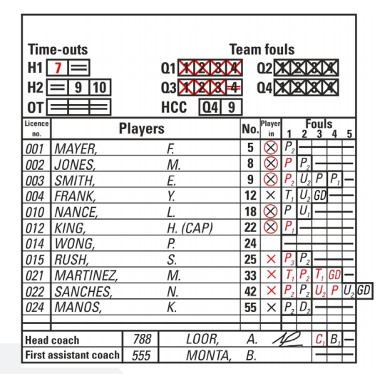 5.当队员5次犯规时,原记录员或助理记录员通知裁判员,这项工作交给了计时员来负责。6.加入了非法侵犯圆柱体的手势和干涉得分/干扰得分的手势。7.加入了主教练挑战的规则说明和相应的手势,并明确了裁判员接收主教练挑战的手势。8.记录表做了相关的格式修改,加了几个首字母简称,增加了HCC的填写。