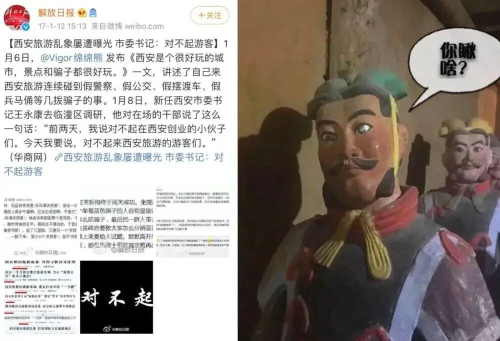 前几年在西安“假兵马俑”风波时期,许多游客去西安甚至要先在网上搜索一版避坑指南,这些指南包括从火车站到景区一路上如何避开和识别出各种骗子。