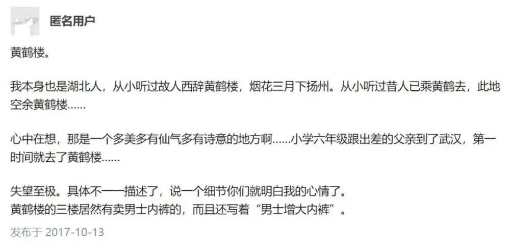 更有网友透露小学6年级去黄鹤楼游玩的时候,发现黄鹤楼的三楼居然有卖男士内裤的,而且还写着“男士增大内裤”。这样一来,“天下第一楼”和“天下绝景”的仙气和意境瞬间荡然无存。