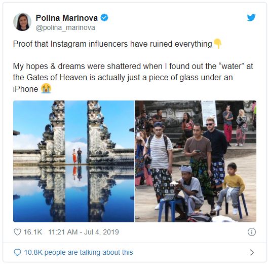 于是千山万水赶来,发现世界上最遥远的距离,无非是一张旅游照骗给你制造的网恋——奔现。△去之前看到的广西阳朔和去之后看到的完全两样/图虫创意最近被CNN评为“此生必去景点”巴厘岛天空之门,看到一张张旅游大片,还以为是像是明镜般的湖光倒影之景。结果后来国外博主曝光:工作人员一手举着手机一手拿着镜子,镜子反射原理加后期修图,一张张创意大片就此诞生。△《财富》杂志编辑发现的天空之门流水线操作/Twitter每个社交媒体上自带“网红滤镜”的景点,迷惑手法一个比一个高超,没有最坑只有更坑。现在的旅游景点,没点拍摄技术和网红滤镜,都不敢拿出来晒了。朋友C就是“受害者”,曾经热衷追逐各种流行的旅游现象,只要朋友圈里一有高端大气上档次的旅游大片,她下一步就给自己计划同样的行程。前段时间她一脸憧憬说自己将会去土耳其,奔着人气超高的棉花堡,看着旅游网站上鬼斧神工的钙化池白色梯田,心想这次准能拍到大片了吧。没想到现实非常骨感,什么白色天然钙化物景观,游客一扎堆拍照一看:这不就是巨型指压板吗,有温泉还不是一样“全民下饺子”?旅游也要讲timing的,要是天气和季节不对,分分钟遇上雷区。就比如这几年非常火爆的蜜月圣地——圣托里尼。都说爱琴海的基克拉德斯群岛是一串散落在爱琴海上的珍珠项链,而圣托里尼就是项链坠子上最耀眼的钻石。但要是碰上不是什么非常对的阳光蓝天,圣托里尼这颗钻石,就好像蒙上一层非常迷惑的灰尘,房屋近看还有些破旧,掉漆严重。△人扎堆天气差的圣托里尼,其实也就那样/ first uploaded /wiki如果你不巧碰上了一个网红景点营销陷阱,那就更冤了。前段时间在社交网络上被炒红的“墨西哥粉红湖”,湖水天然粉红色的形成,多半是因为当地小镇工业制盐厂的盐分,对湖水的藻类的环境影响。然而很多游客花50墨西哥比索去到现场,发现未经加工的粉红湖也不过如此。照骗里的粉红湖有多梦幻浪漫,现实中的湖就有多病态。△粉红色湖除了看timing外,离了滤镜也就平平无奇/图虫创意英国巨石阵也是常年被一群游客吐槽,又有另外一批游客朝圣而至的景点。巨石阵躺在大片上是如此壮观神秘的奇观。到了现场就扎心了——“巨石阵不过就是一堆石头在规则和不规则的边缘摆放排列着。”老艺术家只能说真心佩服这些能拍出旅游大片的网红景点。前段时间有个澳洲摄影师Peter Stewart非常真实披露了所谓的梦幻和超现实大片下的美景与现实的对比。他的初衷不过是想要凸显photoshop的强大功能,但不知道为何作为普通游客,看到的就是旅游买家秀和卖家秀的残酷真相。△意大利五渔山也是常年被吐槽的网红景点/unsplash当然你可以不愿意承认,毕竟实践出真知。一个个踩坑的经验在耳边萦绕——因为一张照片说走就走没问题,但要是认真你就输了。很多人只觉得网红景点障眼法多,但到了现场,还是那句话——来都来了,不拍照不是对不起自己吗?于是宁愿排队3小时,也要等上网红景点短短3分钟的打卡,最后肯定少不了修图1小时。然后发朋友圈,总算给这段旅程画了个句号。尽管你内心骂着mmp,要是能赢得朋友圈的一堆点赞和彩虹屁,这段旅程的过程再坑爹,也能买个足以装点朋友圈的安慰。下一秒又一波前来打卡的游客,又是按例到此一游。于是网红景点就算再坑,这些障眼法也总会收割了不少人的利益。△抖音快手上很火爆西安景点喝酒摔碗,现在已经快没落了这就是我们当下国人出门旅游的常态。最近英国《经济学人》说起当下最流行的旅游方式,就是刷一下15s的短视频打卡游。比如重庆的洪崖洞,从去年开始就因为抖音一跃成了网红打卡地,凡是到场的人只要拿手机拍一拍,就能凑个热闹集赞。△夜晚的洪崖洞被誉为是《千与千寻》拍摄地/图虫创意多少人因为酷似《千与千寻》的取景地远道而至,但撕开那层网红滤镜。很多人发现这也不过是重庆一处仿古风格的吊脚楼群,不过是酒吧、餐馆和霓虹灯堆砌而成。我们既是景点障眼法的受害者,也是障眼法背后的始作俑者。越来越多簇拥而成的人造网红景点,正在紧跟着我们ins风网红滤镜的打卡风潮。巴厘岛再也不是我们心目中的巴厘岛了,除了最近被吐槽的“天空之门”不再,还有网红秋千鸟巢。看到ins旅游博主露着香肩美背,坐着鸟巢般的秋千迎风摇曳在原始热带雨林里,太美好了。很多人心动了,于是到了现场给自己的心动买单。哪有什么原始生态,都处处变成人造景点。背后无非是为了赚钱的商家机构,渴望在网红打卡的风潮分一杯羹,哪哪搭个ins风背景板,哪哪就会成为爆款——“刷爆朋友圈的绝美大片”“今年决不能错过的浪漫圣地”“这年头网红们都去这里打卡了”这些标签还常见吗?△连厕所装点的好看,都会聚集一堆网红拍照打卡/微博截图当景点变成网红打卡景点时,结果很容易变成了原生态的崩坏。最怕的还是原来一尘不染的景点,打卡多了就变成了垃圾场。曾经一则“4万人游天空之镜变垃圾场”的消息,让青海的茶卡盐湖环境污染的惨剧,赤裸裸地暴露在世人面前。就算如此,还是有很多游客抱着朝圣的心,来都来了集邮一番,打卡3分钟感慨天空之镜。作为一个旅游kol,老艺术家说了好多旅游避坑的话题。但唯独景点障眼法这个,老艺术家只能发自内心劝一句:别全怪什么障眼法了,要避坑只能靠